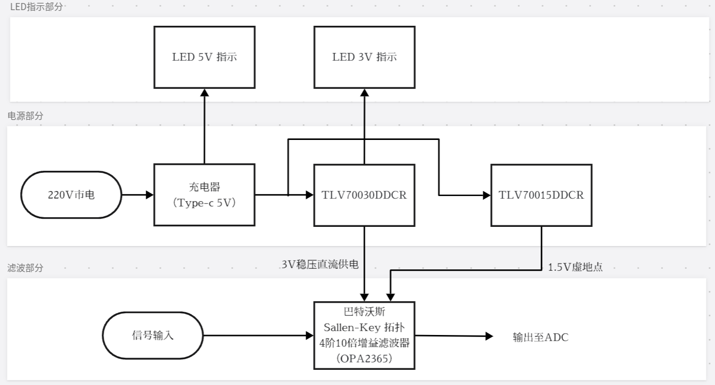 电源我们需要两个,一个是给运放供电的3V电源,一个是用于虚地产生的1.5V电源,本次使用LDO芯片来产生这两个电源。